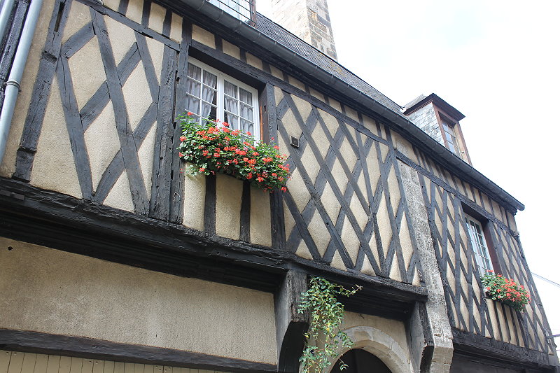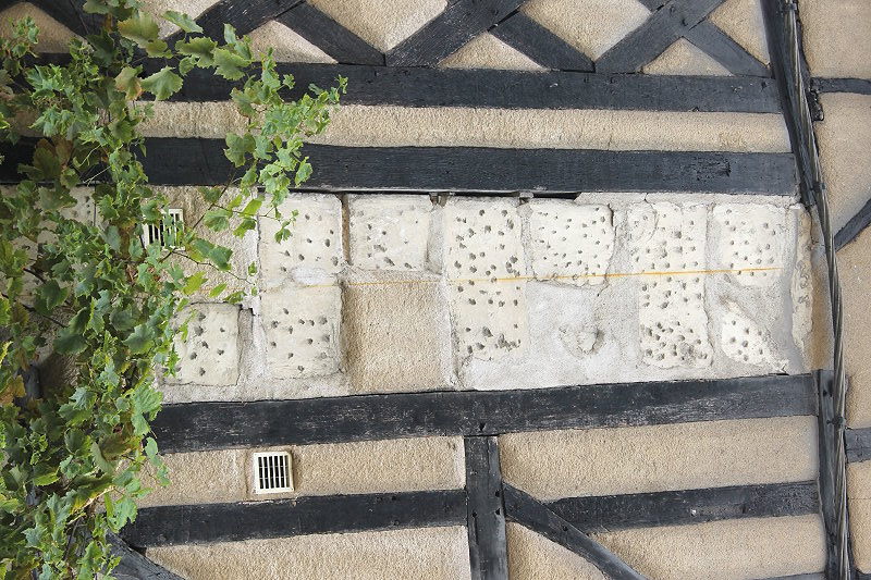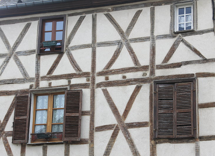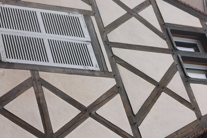 D’après votre question Olivia : « comment ça tient ? » – Déjà, elles sont rarement d’équerre et c’est d’ailleurs tout ce qui fait leur charme. Ces demeures se sont développées au XII e, elles doivent leurs silhouettes étonnantes à la souplesse du bois dont elles sont constituées : des poutres horizontales, des poteaux verticaux que vous observez déjà depuis mes photos, sachant que les poteaux obliques viennent rigidifier la structure.
