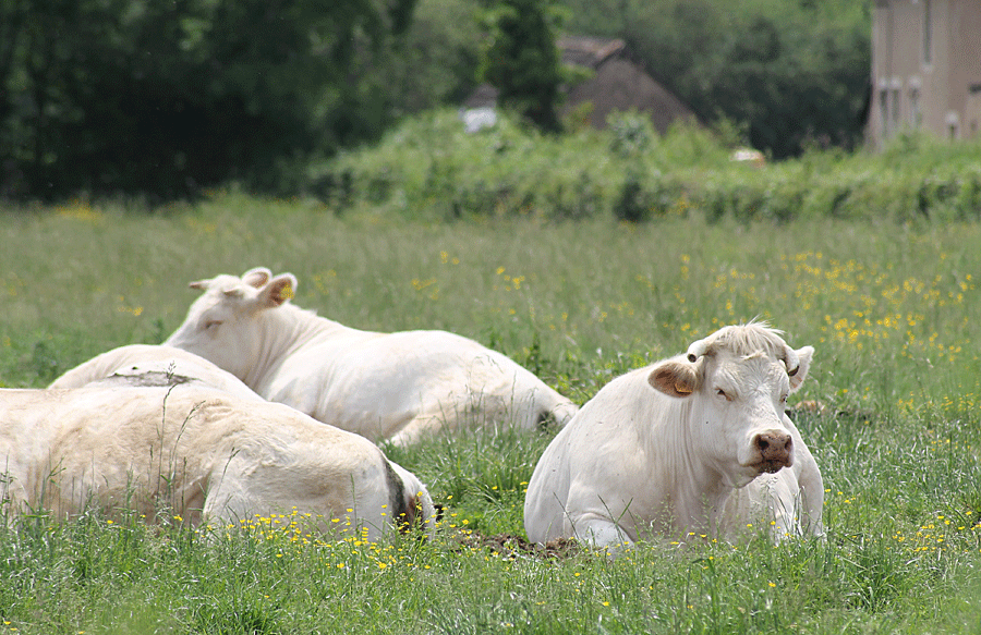 Ce sont tout d’abord les vaches berrichonnes déclinées en ruminantes, gavées d’herbe broutée de long en large. Dans la campagne du Cher et de l’Indre, j’ai photographié ces modèles complaisants, vêtus d’une belle robe crémeuse, pas sauvages pour un sou !