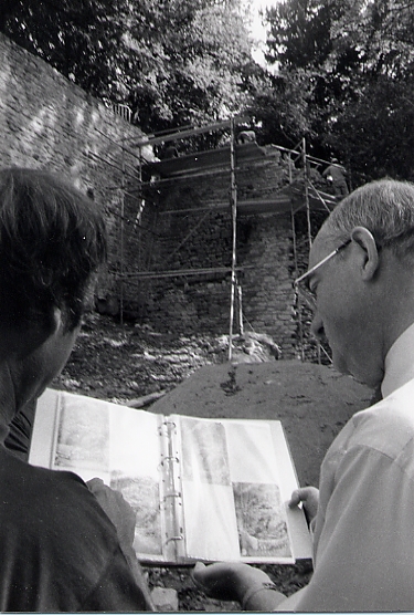 Des années plus tard, la restauration s’envisage patiemment, grâce à l‘Association CHASA (Centre Histoire-Archéologie Saint-Amand-Montrond), équipes de bénévoles accompagnées par Dominique LALLIER qui œuvre passionnément et inlassablement sur le site de Montrond, à l’organisation et interventions, chantiers d’été entre autres (ci-dessus à g. avec M. le Maire Serge VINÇON).