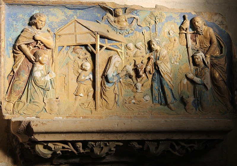 Contexte : Si vous apercevez la cathédrale de loin, même par temps de brume, sachez qu’elle aussi vous voit ! En ressortant de votre visite faite au cœur du sublime vaisseau de pierres, est une autre visite que je vais vous proposer de ne pas manquer lors de votre étape en la cité Berruyère. L’édifice accueille dans l’une de ses chapelles latérales cette pierre polychrome placée en bas-relief dans la « Chapelle de la Nativité ». La Vierge agenouillée située dans la partie centrale, l’Enfant-Jésus et Joseph.