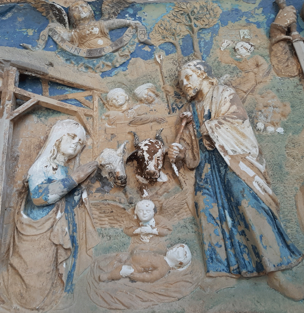 Sur le devant et plus précisément de chaque côté de la scène de la Nativité, sont représentés les apôtres Pierre (à g.) et Paul (à d.) qui semble s’appuyer d’une longue épée (première prise de vue). À l’arrière-plan de la scène de la Nativité, sont montrés des personnages représentant des bergers, ainsi que ce qui pourrait être représentatif de la ville de Bethléem. Qui parmi vous, a vu à partir de cette photo une scène en trois parties ?