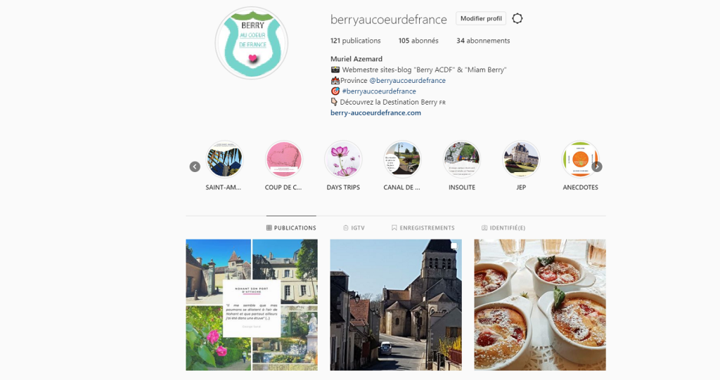 Chez Pinterest, j’épingle des images et articles en provenance de mon site web. Des images déjà vues, mais toujours plaisantes à voir. Sur Insta je publie du contenu. Des termes auxquels je m’adapte au fur et à mesure. Je vous invite à me suivre sur Facebook, Twitter, Pinterest et Instagram, réseaux de communication principaux du site http://www.berry-aucoeurdefrance.com