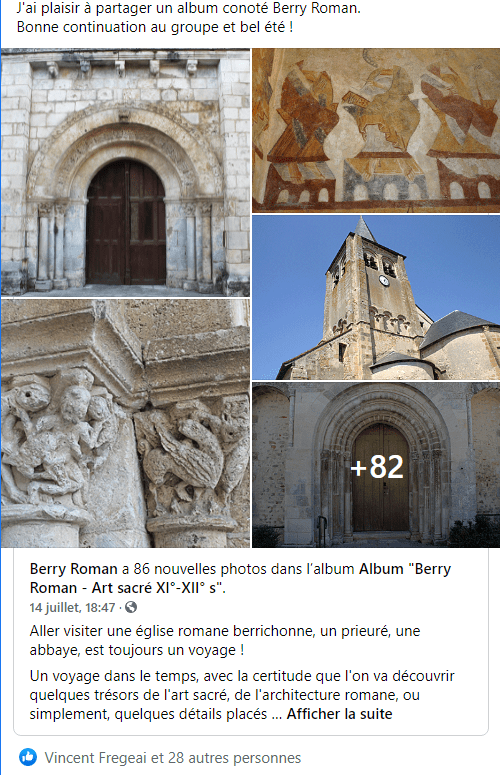 Pour ceux qui n’ont pas encore visité ma page ou vu les articles publiés… Cette semaine j’ai voulu rassembler dans un album la totalité des églises romanes pour lesquelles je suis allé, d’un reportage à un autre. Sous chacune des photos est mentionnée la date de réalisation du reportage (c’est à dire la période couvrant l’année 2011 à 2018). Ainsi, tout y est précisé avec exactitude et par respect de mes publications patrimoniales et touristiques. Tout à commencé en avril 2011 et je vous laisse tout loisir d’aller découvrir l’album : Berry Roman | – je vais continuer d’éditer chaque date.