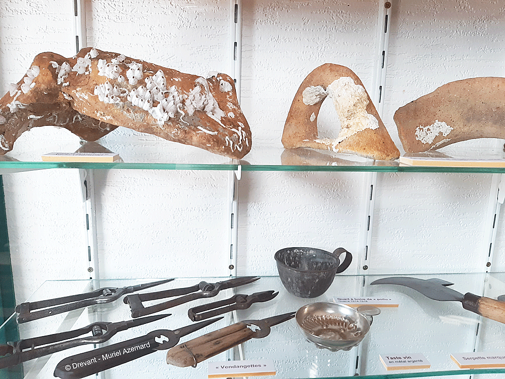 Tout de suite à l’entrée et sur la gauche, les outillages propres aux travaux de la vigne, nombreux témoins de la ruralité vignoble à (re)découvrir. Sur les cotés de ce premier pan de mur, une riche documentation rassemblée. Au centre, une vitrine renferme des objets assortis de leurs légendes, tels que ci-dessous.