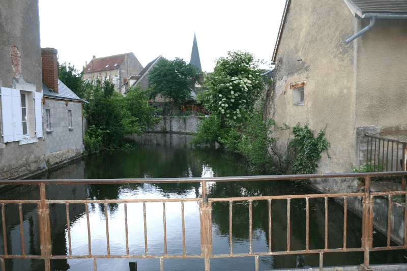 Un moulin qui enjambe une eau, mais non celle que les Saint-Amandois ont pour habitude de côtoyer presque familièrement. Puisqu’il ne s’agit pas de la Marmande, de quel cours d’eau peut-il être question ici, sur ce site ? Pour mieux comprendre voici un autre cliché faisant face à cette partie. C’est sûr, cela relève d’une légère complexité, le cours d’eau a été détourné quelques mètres plus haut, par les pelles.