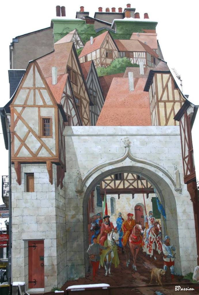 Joli point de vue pour ces fresques en deux échantillons. Elles représentent l’arrivée du bienheureux Jacques-Cœur accompagné de Charles VII, Porte de Bourges, en sa ville natale. Et si l’expression s’arrêtait ici… Que nenni, puisque rien a été omis du remarquable patrimoine des demeures à pans de bois, sur un visuel moyenâgeux. La scène entière fait penser au passage des illustres et de leur chevalerie sous l’arc triomphal.