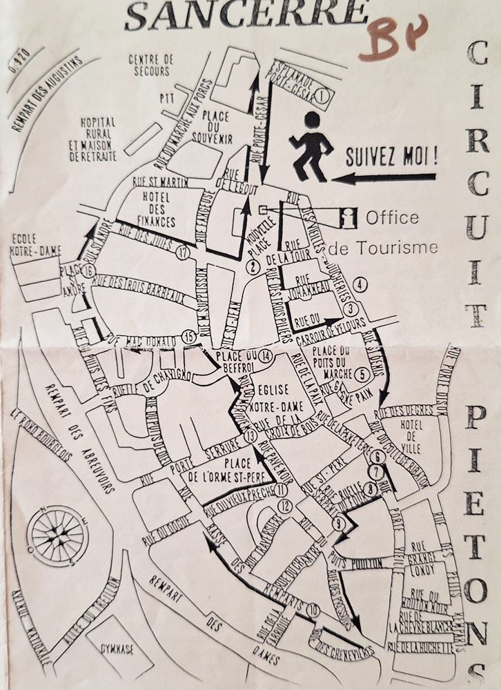 J’ai parcouru le circuit piétons proposée par l’OT de Sancerre. Cette promenade touristique vous fera découvrir le maximum : vous emprunterez les ruelles étroites de la médiévale Sancerre, rues sinueuses, loin d’avoir été conçues pour y voir circuler le tourisme d’aujourd’hui. De fait, vous allez traverser à pied le village, le descendre dans son entier pour rejoindre les vignes que vous traverserez en petite partie, et reviendrez, par une boucle, à votre point de départ. Ayant conservé l’itinéraire, je vous le partage. La promenade comprend 17 haltes au total. Une bonne façon de faire le tour agréablement de la ville à pied.