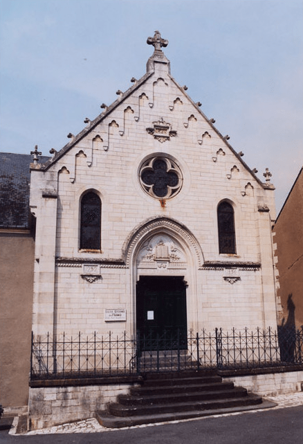 Ci-dessus, le temple de la ville (restauré en 1994). La paroisse appartient à la région Ouest de l’Église réformée française : elle porte le nom de Sancerre-Bords-de-Loire, englobant les deux rives du fleuve de Pouilly à Sully. À l’intérieur, Moïse tient les Tables de la Loi.