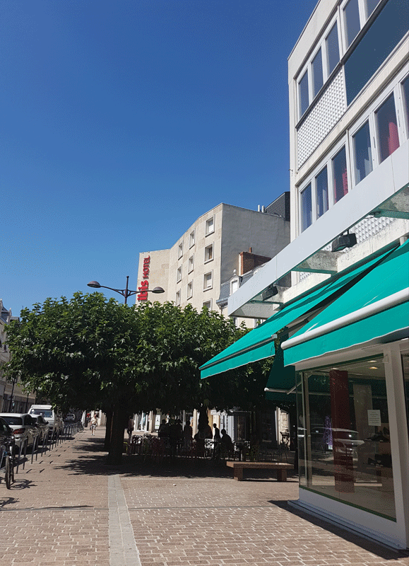 Lorsque je vais de la gare > au marché ce sont les rues et places que j’emprunte au plus rapide du trajet : côtoyant sur la droite le Lycée Sainte-Solange dans la Rue de la Gare (1° photo) – Rue Victor Hugo – Square St-John Perse – Place de la République – Rue Grande où vous trouverez de nombreux restaurants.