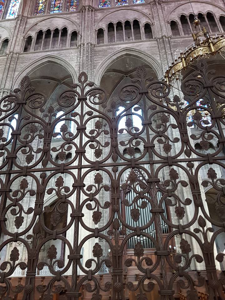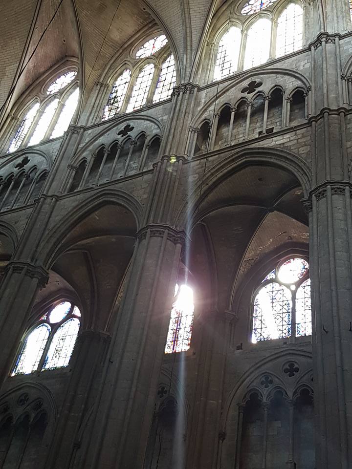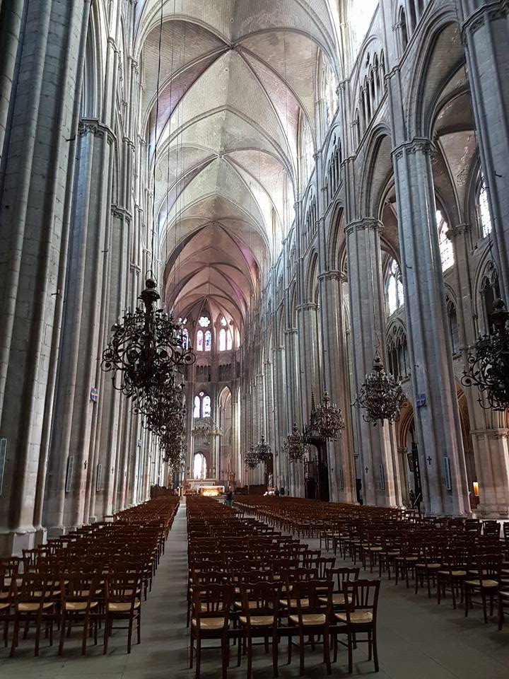 Après avoir souligner à nouveau que la cathédrale actuelle a été érigée sur une cathédrale moins vaste que celle-ci et romane, l’histoire de la merveilleuse architecture céleste nous enseigne quant à un édifice dépourvu de transept, ses 5 nefs dont chacune répond aux 5 portails, une voûte sexpartite s’élevant jusqu’à 36 m sous clé.