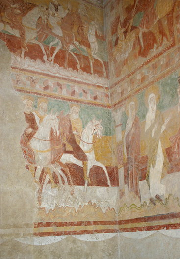 - Les Rois Mages : à droite du mur nord, se retrouvent sur les deux registres. Au registre supérieur, l’arrivée des mages et au registre inférieur, le départ des mages. « Ils vinrent d’un côté et repartirent d’un autre pour éviter d’avoir à renseigner le tétrarque de Galilée ». Sur leurs chevaux alternés blanc et alezan clair, richement harnachés, les rois astronomes sont vêtus de courtes tuniques. L’une des couronnes est ornée de fleurs de lys.