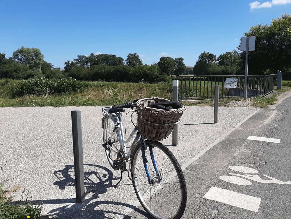 Alors qu’il y a peu entre Drevant et La Tranchasse, à environ 300 mètres avant d’arriver au grand ouvrage patrimonial, on trouve un panonceau sur lequel est stipulé de descendre du vélo pour aller à pied. En effet, le cheminement se fait des plus étroits ici, nous franchissons de fait une sorte de pas-à-pas nature par la gauche. En rando, nous en avons vu quelques-uns déjà, les plus hardis sans doute, mais aux pneus plutôt lytes.