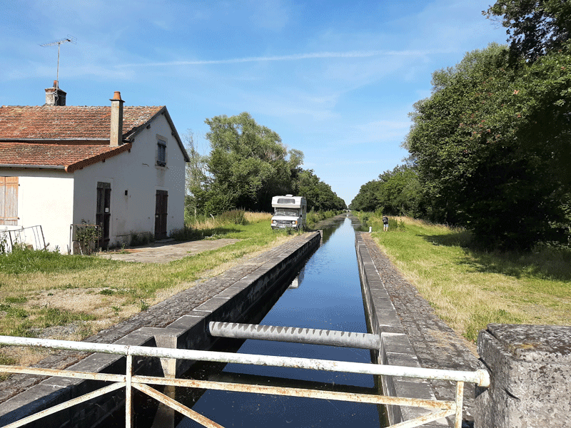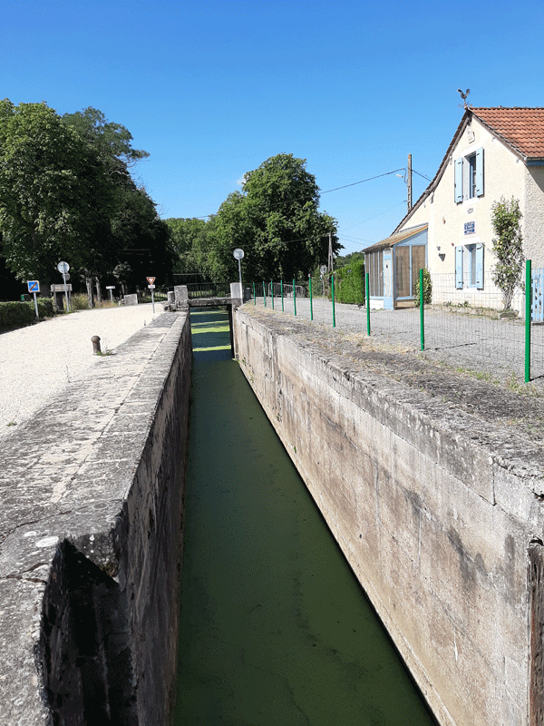 À hauteur du Breuil et dix minutes d’arrêt, je remonte en quelques secondes, plus haut, d’où je terminerais la balade. À remarquer que la partie droite de l’écluse, lorsque nous venons de Clairins, est asséchée sur une bonne longueur.