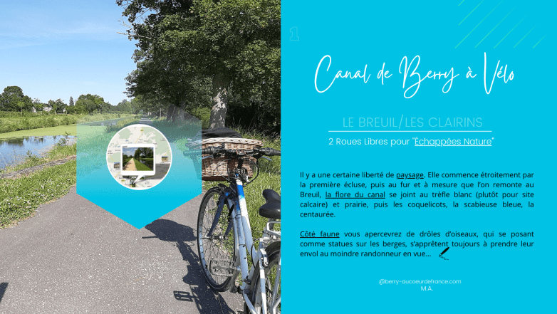 Ma petite dernière ! À peine sortie de la ville, la fleur aux dents, je passe par l’écluse de Clairins. C’est le nom, jouxtant Saint-Amand. Je pédale, écoutant le chant des oiseaux. Je ralentis, m’arrêtant un instant : pour me rafraichir et contempler le Canal de Berry, même brièvement.