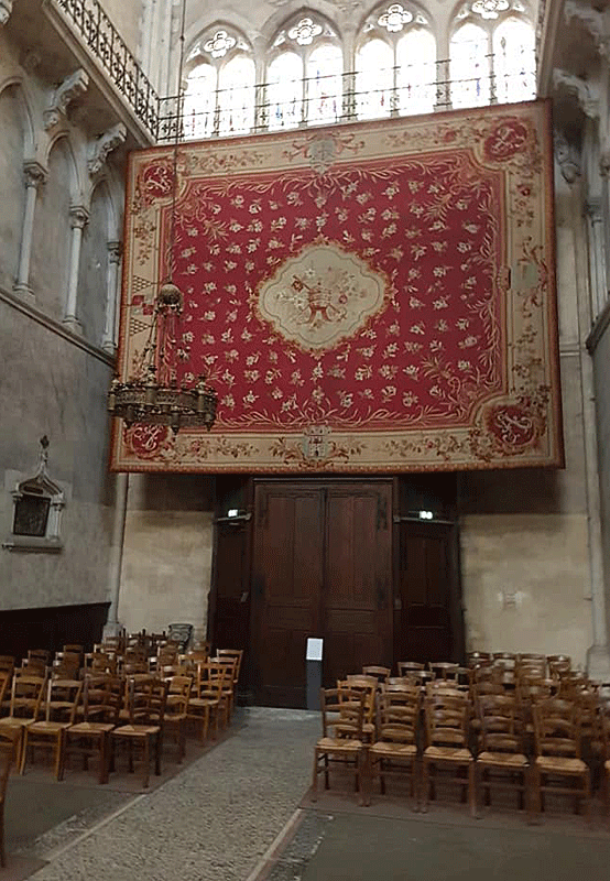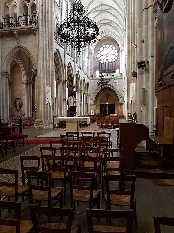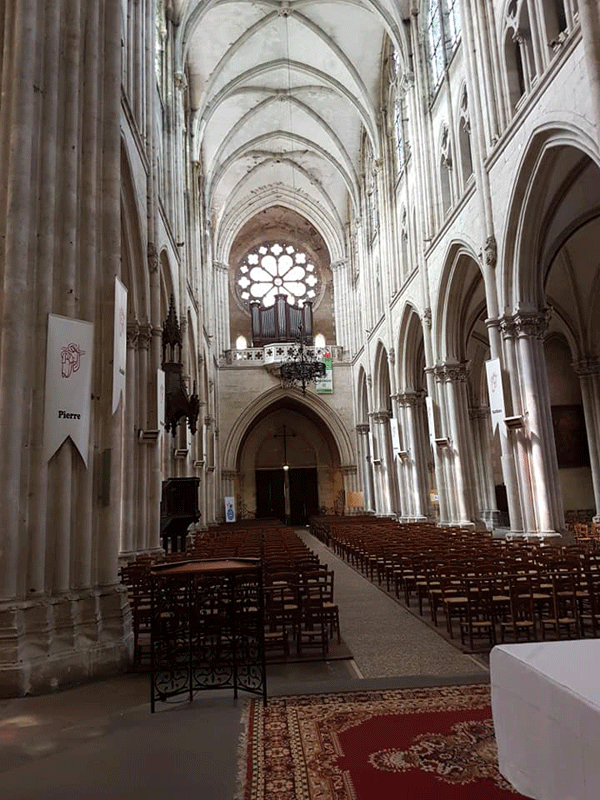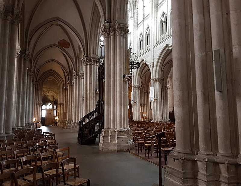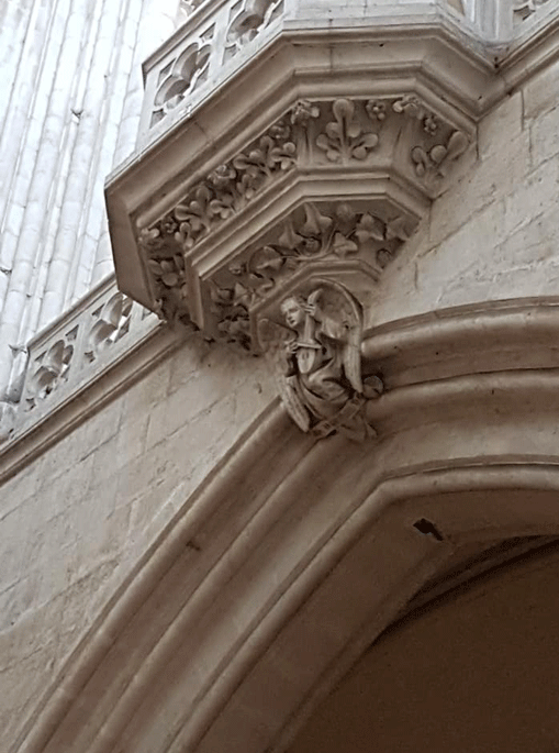 Après avoir vu les deux flèches extérieures chapeauter et les détails d’architecture, j’entre à l’intérieur par l’une des portes ouvrant sur la nef. Mes trois premiers pas m’amènent sous la tribune d’orgue qui surplombe. L’ange musicien nous accueille en cul-de-lampe très orné par des feuillages.