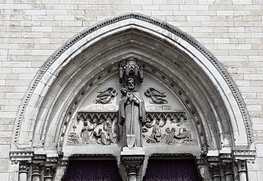On commence avec un point de vue que nous ne pouvons pas manquer, tant celui-ci est mis en exergue, en valeur par son environnement lui-même. J’avais vraiment envie de vous partager des images en me laissant guider, de l’extérieur à l’intérieur de l’édifice. Après quoi, je fais un petit dialogue des divers éléments d’architecture. Par exemple, l’image que vous voyez ci-dessus, c’est la représentation du patron des maraîchers et jardiniers – Saint-Fiacre et les bas-reliefs qui l’encadrent. C’est de ce côté que nous arrivons, venant de la gare.