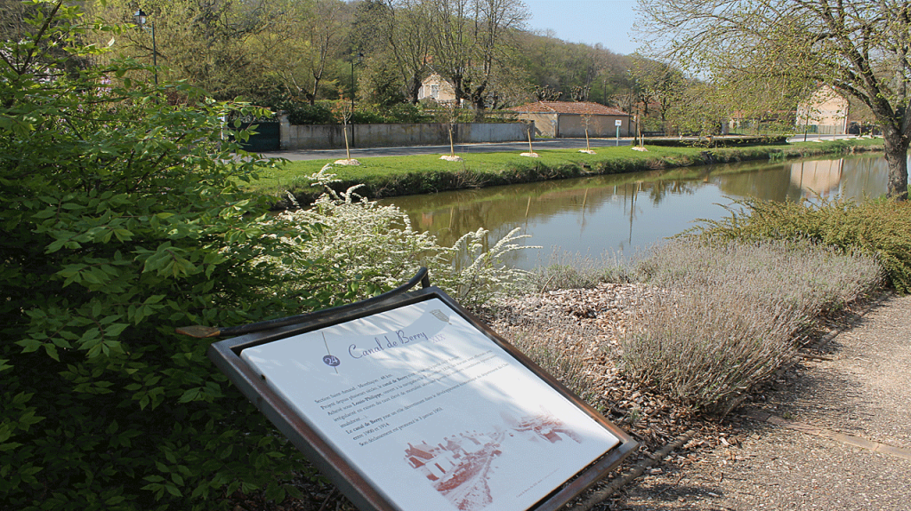 Entre la Route de Montluçon jusqu’à la Croix Flambard il y a des choses intéressantes à découvrir, à connaître. Tout de suite, la signalétique touristique qui décrit l’histoire de la navigation à partir de l’endroit où cette signalétique a été placée. Mais elle se trouve de l’autre côté de la berge, qui n’est donc pas dans le sens du parcours sur lequel nous nous trouvons en ce moment.